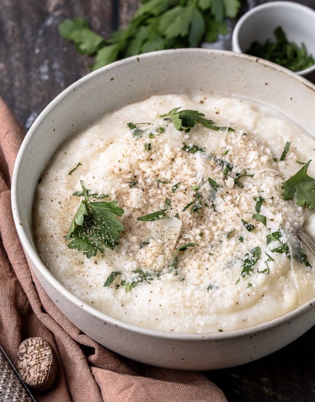 - Mix de bloemkool met roomkaas, olijfolie/boter, nootmuskaat, peper en zout tot een gladde puree. Houd warm.